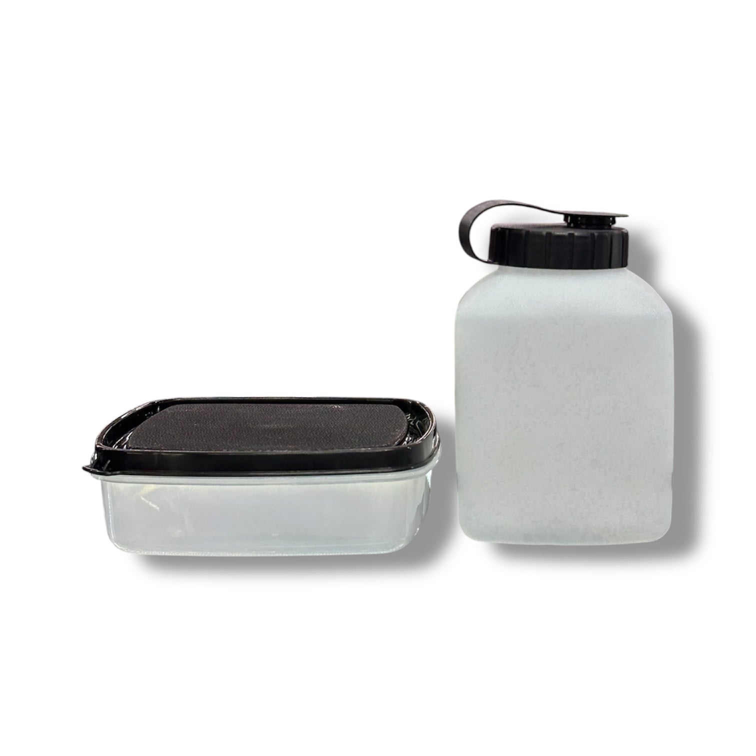 • Túper para comida: Un recipiente rectangular con tapa hermética negra, diseñado para evitar derrames de alimentos sólidos o semisólidos.