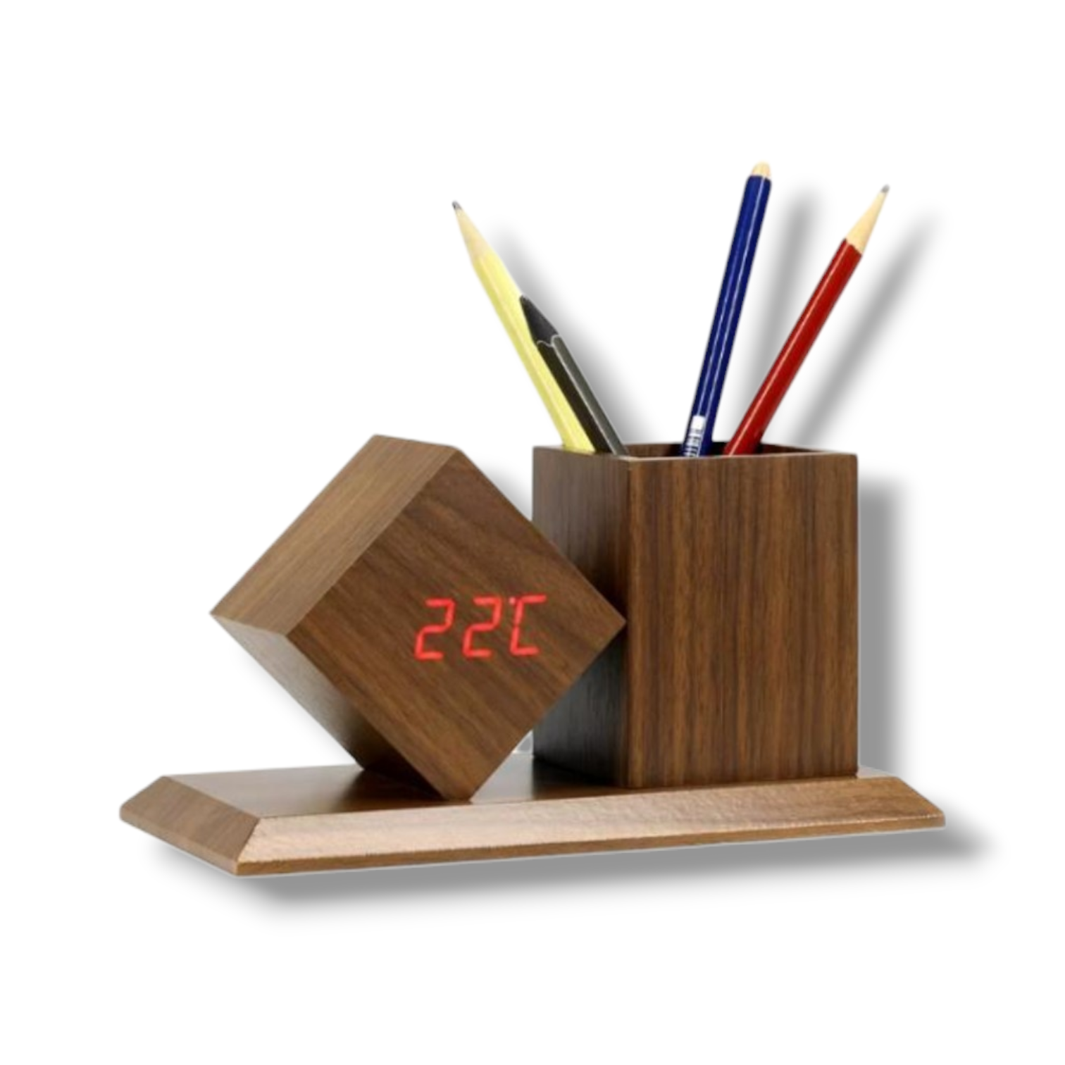- Estructura: Diseño funcional que incluye un reloj digital en forma de cubo inclinado y un compartimento integrado para organizar lápices y bolígrafos.